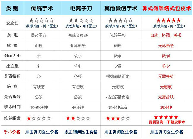目前割包皮技术有哪些?哪种技术规范合理? 男性朋友询问:看完以上内容,我知道包皮过长必须手术割掉,但是市面上这么多的手术方式,真的很难选择,请专家给点建议。 马鞍山康豪泌尿专科医院王乃康主任解答: 1、包皮包茎的手术方法很多,每个医院所采用的手术方法也不一样,适合自己才是规范合理的。 2、包皮技术主要有传统切割技术、电离子刀手术、欧式微雕绣式包皮术及其它创伤小手术,目前来看,欧式微雕绣式包皮术最适合亚洲男性。 推荐欧式微雕绣式包皮术的理由: 理由一:技术成熟可靠。由领域生殖整形协会副主席hee sun Kim博士经过50000例包皮包茎患者临床验证过,高效可靠。 理由二:临床效果良好。8000例手术0事故。临床效果跟踪验证,包皮过长男性接受这种手术后,95.6%的人性功能明显提升。 理由三:术后自然美观。杜绝其他普通包皮手术术后缝合处凹凸不平非常难看、黑线圈、硬结等情况发生,保证术后生殖器美观度。 欧式微雕绣式包皮术与其它包皮手术对比