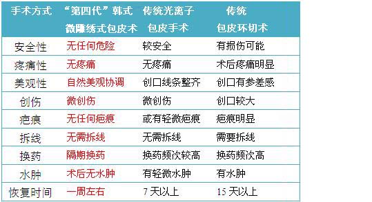 小手术中的大智慧 五大优势完胜其他手术 ①无痕无疤 美观大器 术前利用欧洲全数码生殖整形测量系统对手术位置进行高效定位;术中用纳米光刀、切割平衡器进行高效切割,切缘整齐美观,不易造成包皮切除过多或过少所致痛性勃起或阴茎上翘、阴茎头不能外露等并发症。 ②出血少 高效微痛 整个手术过程中10~30分钟,无需切断阴茎浅静脉。纳米光刀可电凝血管,术中出血少同时减少止血时间;因手术视野清楚,故而无需结扎出血点; ③恢复快 不刺激勃起 手术创伤极小,无需住院,术后恢复快,不影响生活和工作,无任何副作用。手术中因无需切断血管,所以手术不会因小血管回缩导致术中、术后形成血肿;术后局部水肿反应轻,也不存在因出血点结扎线头刺激引起的疼痛性勃起;缝合系带处时我们还采用了 “U”字缝合,在结扎皮肤的同时止血,从而进一步确保了手术的高效性及手术的快速恢复。 ④无需拆线 浑然天成 特制3mm头发丝般细羊肠线缝合,无特殊排斥反应者,术后无需拆线;7天左右缝线自行吸收脱落,由于不致牵扯切缘皮肤,极大地减轻了包皮环切术后拆线的痛苦。 ⑤提高功能 效果显著 切除包皮后,龟头裸露,敏感减弱,性生活时间延长10分钟左右,明显提高夫妻生活质量,更可以避免包皮垢引发的男女双方生殖系统的反复感染和恶变。